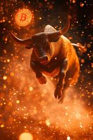 Een majestueuze stier zweeft krachtig door een gloeiende, sprankelende atmosfeer terwijl het Bitcoin-symbool boven hem zweeft. Deze dynamische scène belichaamt kracht en het streven naar succes. De afbeelding is ideaal voor een modern kantoor of creatieve werkruimte en biedt inspiratie en motivatie.