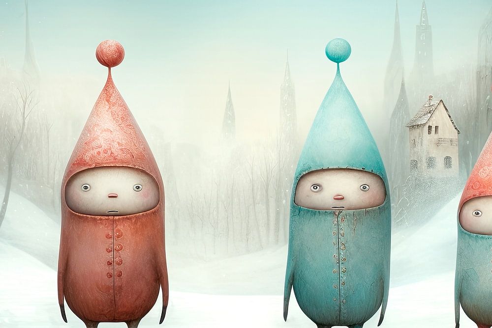 Ontdek de charme van de schattige kabouters in hun ijzige fantasie. Deze serie afbeeldingen vertelt een fantasierijk verhaal terwijl de kleine elfjes met hun puntmutsen door besneeuwde landschappen dwalen, sleeën en eenzame paden verkennen. De artistieke illustraties nemen je mee in een wereld vol magie, humor en winterse eenzaamheid. De afbeelding is gemaakt met behulp van AI en geoptimaliseerd met behulp van beeldbewerkingsprogramma's.