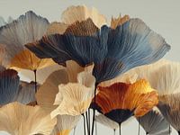 Een minimalistische botanische compositie die de poëzie van de vormen van de natuur viert. Lagen van delicate, aderachtige bloemblaadjes in gedempt goud, diepe leisteen en zachte crème smelten samen tot een serene balans van beweging en rust. Perfect voor moderne, organische interieurs die op zoek zijn naar warmte en rustige verfijning.