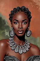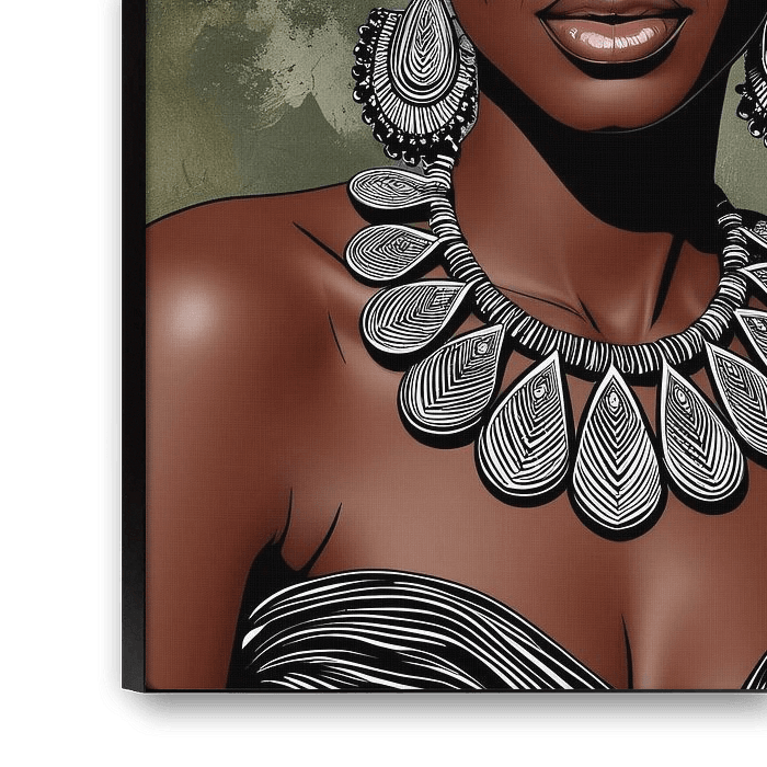 Dit opvallende ontwerp toont een prachtige Afrikaanse vrouw, elegant en krachtig afgebeeld in digitale kunststijl. De zwarte vlechten en gedetailleerde sieraden contrasteren mooi met de rijke aardetinten op de achtergrond. Het gebruik van monochrome patronen in haar halsketting en oorbellen geeft een gevoel van traditie vermengd met moderniteit. Dit kunstwerk straalt een tijdloze schoonheid uit, perfect om elke ruimte een unieke en culturele touch te geven. De strakke lijnen en het subtiele kleurenschema maken het een veelzijdige decoratie voor verschillende interieurs. Hang dit portret in je kantoor of slaapkamer en geef je ruimte een stijlvol, modern accent met een vleugje elegantie en kracht.