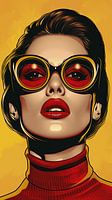 Dit kunstwerk toont een close-up portret van een vrouw in een opvallende pop-artstijl. De heldere kleuren en scherpe lijnen benadrukken haar expressieve rode lippen en grote, ronde bril met dikke zwarte en gele randen. De achtergrond is een gedurfde gele tint die de aandacht naar haar gezicht trekt. De rood-oranje coltrui voegt warmte toe aan het beeld, terwijl de minimalistische details de focus op haar gezichtsuitdrukking houden. Het werk geeft een prachtige indruk van de pop-artstijl, waardoor de essentie en sfeer van deze kunstvorm tot leven komen.