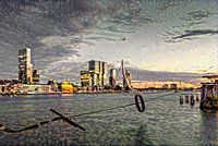 Haal de ruige schoonheid van Rotterdam in huis met dit werk van Slimme Kunst. Vanaf de kade ziet u de Erasmusbrug uitstijgen boven de Nieuwe Maas. Dit beeld is weergeven in de typische stijl van het Impressionisme. Met schetsmatige, bijna slordige streken wordt een minimalistische impressie gecreeërd die de beeldschone rauwheid vertolkt van deze belangrijke havenstad.