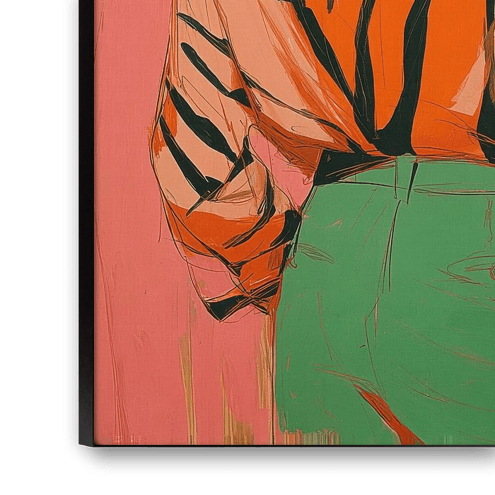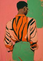 Het schilderij toont een man van achteren, vanaf zijn middel, met een donkere huid en kort, zwart haar. Hij draagt een oranje top met zwarte strepen en een groene rokachtige onderkant tot halverwege zijn dij. De bril heeft een dun metalen montuur. De achtergrond is overwegend roze, met zichtbare verticale penseelstreken en een groene rechthoek rechtsboven. De expressieve schilderstijl benadrukt textuur, kleur en beweging. De figuur staat rechtop en ontspannen, met haar armen gekruist achter haar rug. Warme, verzadigde kleuren creëren een moderne, stedelijke sfeer.