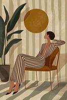 Een stijlvolle illustratie in moderne minimalistische stijl toont een elegante setting waar schaduwen en lijnen samenkomen. Een gestreepte jumpsuit vormt een perfect contrast met de organische vormen van een kamerplant en de warme ronde zon. De aardse tinten en geometrische patronen creëren een harmonieuze compositie die urban…