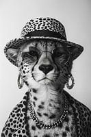 Zwart-witfoto van een jachtluipaard in stijlvolle kleding, inclusief hoed en zonnebril, tegen een grijze achtergrond.