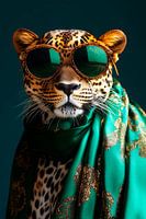 Een stijlvol luipaard met een trendy zonnebril en een elegante groene sjaal straalt een buitengewone mix van glamour en wildheid uit. Dit levendige kunstwerk zal ieders aandacht trekken en brengt een vleugje exotisme in elke woonkamer, perfect voor creatieve zielen die van het buitengewone houden.