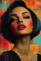 Dit digitale kunstwerk in pop-artstijl toont een verbluffende zwartharige vrouw wier schoonheid indrukwekkend wordt geaccentueerd door felle kleuren en gestileerde details. Haar gitzwarte haar vormt een fascinerend contrast met haar lichtgekleurde huid en geeft het schilderij een mysterieuze maar elegante uitstraling. De volle rode lippen vormen een centraal element van het schilderij en zorgen met hun intense kleur voor een sensueel en fascinerend accent.