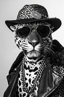 Een zwart-wit afbeelding van een luipaard in modieuze kleding, compleet met hoed en zonnebril. De perfecte mix van wilde dieren en stijl.