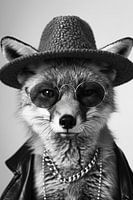 Zwart-wit portret van een vos in een modieuze leren jas en hoed, versierd met een halsketting en een ronde bril. Een perfecte mix van de dierenwereld en menselijke mode.