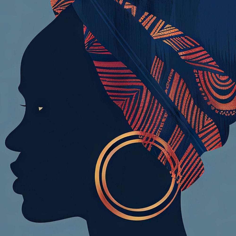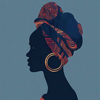 De foto toont het profiel van een vrouw met een uitgebreid geknoopte tulband met levendige patronen in rood en blauw. Ze draagt grote, gouden oorbellen. De achtergrond is zacht blauw, wat het silhouet van de vrouw en de details van de tulband benadrukt. De compositie straalt stijl en elegantie uit.