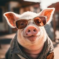 Een schattig varken met zonnebril lacht naar de camera en draagt modieuze kleding. Deze high-definition foto heeft een hoge resolutie met professionele kleurcorrectie en heldere focus.