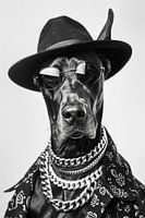 Een portret van een stijlvolle Doberman met zonnebril en hoed, gepresenteerd in zwart-wit. Aantrekkelijk voor moderne en creatieve presentaties.