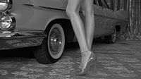 Het tafereel toont de benen van een vrouw, gracieus gekleed in glanzend hoge hakken, die subtiel op de prachtige vloer staan met een decoratief patroon. De auto op de achtergrond, een klassieke vintage schoonheid, straalt verfijning en een vleugje retro-glamour uit. De chromen details van de auto reflecteren het omringende licht, wat een dynamisch spel van glans en kleur creëert. Het sfeervolle tapijt en de gordijnen versterken de warme en theatrale sfeer, terwijl de compositie een tijdloze elegantie benadrukt.