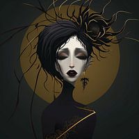 In de wereld van artistieke verfijning onthult dit abstracte vrouwenportret een enigmatische vrouw, gehuld in donkerbruine tinten doordrenkt met goudkleurige accenten. Haar gesloten ogen stralen mysterie uit, terwijl een extravagante hoed, als een zonnebloem in volle bloei, op haar hoofd siert.