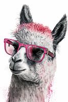 Een elegante alpaca in zwart-witte lijnen draagt een opvallende roze zonnebril en straalt een vleugje glamour uit. Het stijlvolle beeld combineert op speelse wijze natuur en mode.