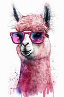Een elegante alpaca in zwart-witte lijnen draagt een opvallende roze zonnebril en straalt een vleugje glamour uit. Het stijlvolle beeld combineert op speelse wijze natuur en mode.