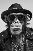 Portret van een chimpansee in een leren jas en een ronde zonnebril, stoer en nonchalant. Zwart-wit fotografie.