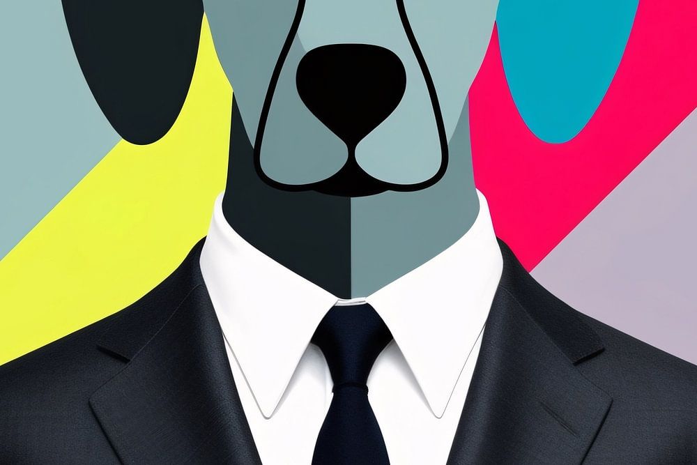 Dit unieke kunstwerk combineert de charmante aanwezigheid van een hond met de verfijnde stijl van een elegant zwart pak. De kleurrijke geometrische achtergrond zorgt voor een dynamisch contrast, waardoor het ontwerp een moderne, speelse uitstraling krijgt. Het portret straalt een gevoel van humor en originaliteit uit, perfect voor liefhebbers van eigentijdse kunst met een knipoog. Dit stuk zou prachtig passen in een kantoor of woonkamer en brengt een verrassend speelse toets aan elke ruimte. De strakke lijnen van het pak en de heldere kleuren in de achtergrond geven het een modern karakter, terwijl de hond in menselijke kleding het geheel een unieke twist geeft. Een perfecte toevoeging voor wie op zoek is naar een kunstwerk dat zowel humor als stijl uitstraalt.