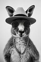 Uniek portret van een kangoeroe, gekleed in een stijlvolle jas en versierd met een hoed en zonnebril in zwart-wit.