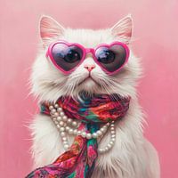 Met een vleugje glamour en een snufje charme presenteert deze stijlvolle kat zichzelf met een hartvormige zonnebril. Gewikkeld in een kleurrijke sjaal en omringd door accessoires met parels straalt ze zelfvertrouwen en elegantie uit. Haar stralend witte vacht harmonieert perfect met de zachtroze achtergrond en voegt een speelse verfijning toe aan de algehele look.