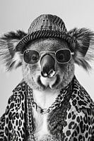 Een koala in zwart-wit met een hoed en zonnebril die er stijlvol en trendy uitziet. Perfect voor humoristische en creatieve projecten.