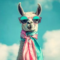 Met een coole zonnebril en een kleurrijke sjaal is deze lama een echte trendsetter. Zijn zelfverzekerde uitstraling en nonchalante charisma geven hem een charmante, bijna menselijke uitdrukking. Tegen een dromerige hemel straalt hij sereniteit en levensvreugde uit, perfect voor een ontspannen dagje in de zon.