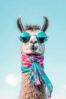 Een stijlvolle lama poseert midden in een felblauwe lucht en straalt vakkundig een vleugje extravagantie uit met een glinsterende turquoise zonnebril en een felgekleurde sjaal. Zijn vastberaden houding en charmante look maken hem de perfecte trendsetter in de dierenwereld. Een echt mode-icoon op vier poten!