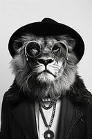 Een creatief monochroom portret van een leeuw, modieus versierd met een hoed, bril en halsketting. Ideaal voor stijlvolle en unieke kunstwerken.