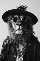 Een creatief portret van een leeuw gekleed in een zwart leren jack en een modieuze hoed met een ronde bril die stoerheid en stijl uitstraalt.