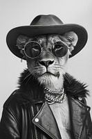 Een monochrome foto toont een leeuw in modieuze kleding, waaronder een leren jas en hoed. Het portret straalt stoerheid en uniciteit uit.