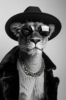 Een indrukwekkend portret van een giraffe, stijlvol gekleed met hoed en zonnebril. Deze monochrome afbeelding straalt stoerheid en uniciteit uit.