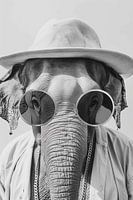 Een portretfoto van een olifant, modieus versierd met een hoed en zonnebril. De foto is zwart-wit en heeft een humoristische, creatieve touch.