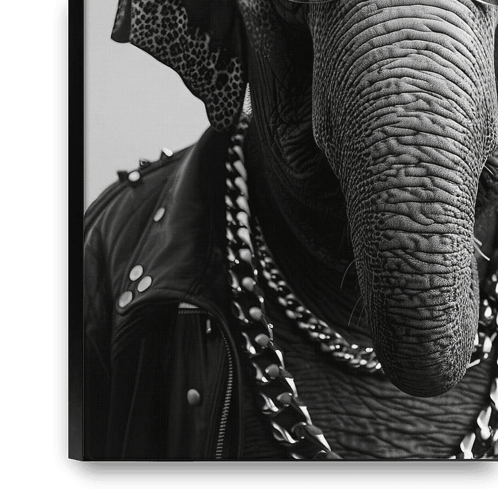 Dit fascinerende beeld toont een olifant stijlvol gekleed met een hoed en zonnebril, vastgelegd in een monochrome toon.