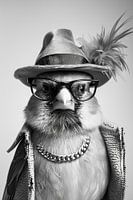 Een elegante rode kardinaal draagt een modieuze zonnebril en een gebreide muts. De afbeelding in zwart-wit benadrukt zijn stijlvolle verschijning en charisma.