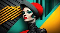 Haar gezicht, gekenmerkt door symmetrie en elegante abstractie, schittert met intense smaragdgroene ogen en felrode lippen. Haar hoed en kleding lijken afkomstig uit een futuristische wereld waarin mode en architectuur samensmelten. De zorgvuldige rangschikking van de lijnen in haar kleding en hoofddeksel geeft de indruk van een geraffineerd patroon dat tegelijkertijd organisch en mechanisch is.