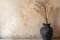 Een prachtig minimalistisch ontwerp dat rust en eenvoud uitstraalt. De verweerde donkere stenen vaas gevuld met sierlijke droogbloemen vormt een tijdloze decoratie. De zachte beige muur op de achtergrond voegt een warme en natuurlijke uitstraling toe, perfect voor elk interieur dat een kalme en serene sfeer wil creëren. Geschikt voor woonkamers, hallen of zelfs kantoren, dit ontwerp brengt een vleugje elegantie en verfijning in elke ruimte. Ideaal als muurdecoratie of inspiratiebron voor interieurstyling.