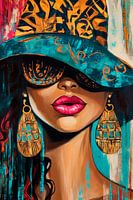 Stijlvolle elegantie en een vleugje mysterie omhullen deze fascinerende figuur met haar extravagante hoed en felle oorbellen. De levendige kleuren en gedurfde accenten stralen persoonlijkheid en creativiteit uit. Dit kunstwerk voegt een moderne, artistieke flair toe aan elke woonkamer en trekt alleen al door zijn charme de aandacht.