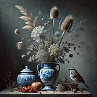 Een sfeervol stilleven met een rijk boeket in Delfts blauw, gecombineerd met warme herfsttonen en een rustig vogeltje op de voorgrond. Een tijdloos beeld dat rust en elegantie uitstraalt.