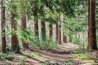 Rustieke en sfeervolle foto van een typisch bospad in een bos in Leersum (Nederland), waarin het zonlicht tussen de bomen door op het pad valt.