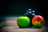 Stilleven van 2 appels en druiven op een tuintegel ondergrond.
