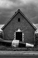 Een krachtig zwart-wit beeld waarin architectuur en een onverwacht object samen een vervreemdende stilte creëren. De strakke compositie en dreigende lucht geven de foto een verhalend en bijna surrealistisch karakter. Een opvallende kunstprint die nieuwsgierigheid wekt en een sterk statement maakt in een modern of industrieel interieur