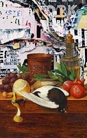 Dit is een onderdeel uit een stilleven, lang geleden geschilderd door de Deense (vrouwelijke) kunstschilder Christine Løvmand (1803-1872) gecombineerd met een hedendaagde foto van gescheurde posters en affiches op een stadsmuur.