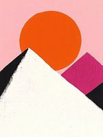 Een minimale berglandschapcompositie waarin kleur de hoofdrol speelt. De zon gloeit als een zintuiglijke vlek van warmte en contrast tegen een zachte roze hemel. De bergtoppen zijn strak en grafisch, maar ademen stilte en een soort tedere monumentaliteit. Ik wil met dit werk een gevoel van verstilling oproepen — alsof je even boven de…