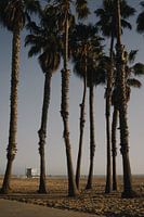De palmbomen staan in een onregelmatige rij, elk met een eigen houding, alsof ze onafhankelijk van elkaar hebben besloten te blijven. Het licht is laag en schuift langs de stammen, waardoor schaduw en structuur belangrijker worden dan kleur. Op de achtergrond ligt het strand open en stil, met een lifeguard-toren die zijn functie lijkt…