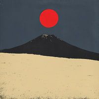 Een eenvoudige weergave van een berg met een rode zon die erboven zweeft. De minimalistische stijl benadrukt de kracht en schoonheid van natuurlijke elementen, met een dramatisch contrast tussen de kleuren.