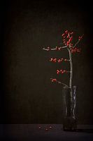 Dit is een dramatisch en minimalistisch fine-art stilleven van een tak met felrode Winterbessen (Ilex), geplaatst in een eenvoudige glazen vaas. De compositie is geschoten tegen een diepzwart, fluwelen decor, waardoor de tak en de bessen bijna uit het duister lijken te treden. Let op de subtiele reflecties van de bessen in het water en het bijna transparante glas van de vaas – kleine elementen die het tafereel een tijdloze diepte geven.