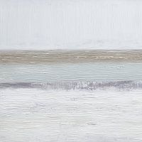 Een uiterst serene compositie opgebouwd uit horizontale kleurbanen. Witte en grijze lagen wisselen elkaar af met daartussen een vleugje turquoise en beige. De penseelvoering is zichtbaar maar gecontroleerd, waardoor het werk structuur en rust tegelijk uitstraalt. Het geheel lijkt te verwijzen naar een horizon, een zeelandschap of…