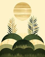 Centraal staat een gestileerde zon, uitgevoerd in strepen die doen denken aan houtnerven, wat een organisch gevoel geeft. De zon wordt geflankeerd door twee palmachtige figuren die met hun lineaire en gestructureerde vorm een contrast vormen met de ronde zon.