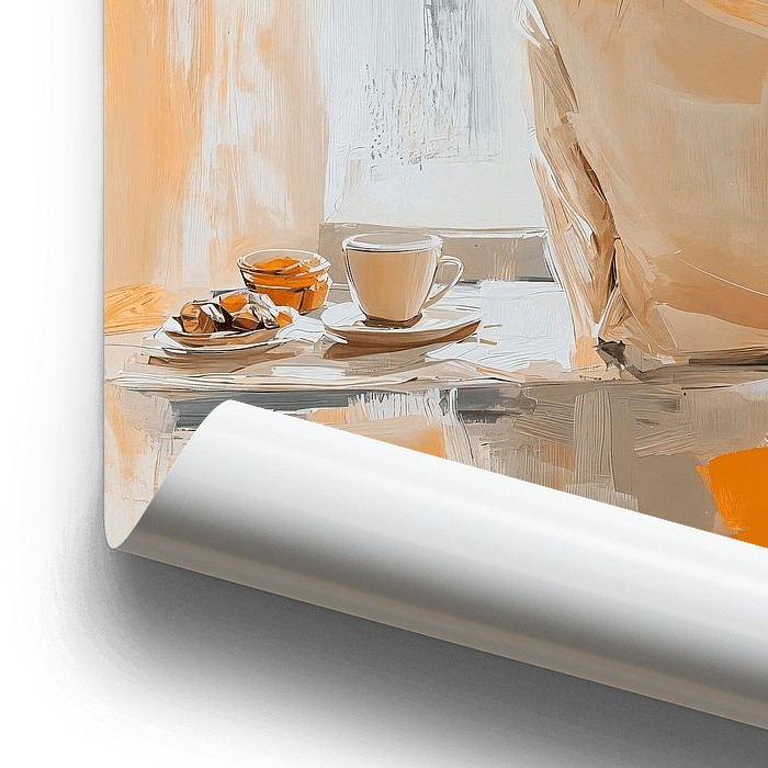 Een schilderij van een vrouw die met haar gezicht naar het raam zit, genietend van een rustig moment met een kop koffie en gebak. De zachte, warme kleuren en vloeiende penseelstreken benadrukken de serene sfeer van een nieuwe dag.