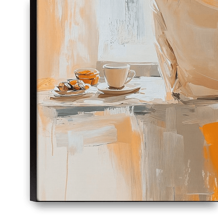 Een schilderij van een vrouw die met haar gezicht naar het raam zit, genietend van een rustig moment met een kop koffie en gebak. De zachte, warme kleuren en vloeiende penseelstreken benadrukken de serene sfeer van een nieuwe dag.
